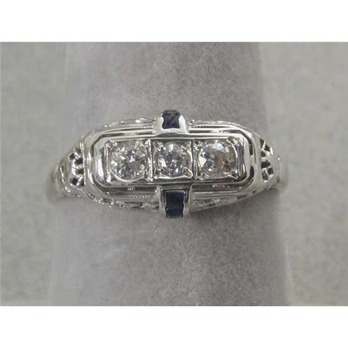 Wonderful 18K white gold filigree ring set with three diamonds of mixed cuts and together are estimated to total over 1/2 carat. The ring is accented with calibre cut sapphires. It is a size 8 1/4 and weighs 3 grams.