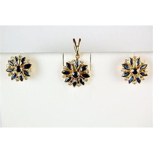 18k Yellow Gold Pendant AND Earrings. Each Earring and the Pendant is set with 8 Marquise Cut SAPPHIRES and 8 DIAMONDS. The Sapphire Total Weight = 3.50 CARATS and the Diamond Total Weight = .50 CARATS! The Pendant and the Earrings measure 1/2 inch across. The Earrings have post style backs for pierced ears.