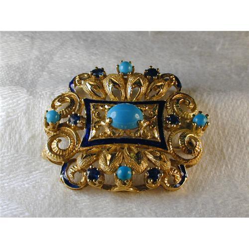 <tr><td>Title:18K Filigree Turquoise Sapphire Enamel Brooch</td></tr>