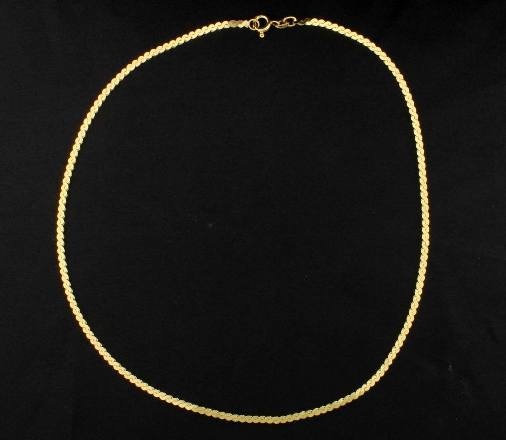 In 18K yellow gold, the chain is 15 1/4 inches long. 9.1g