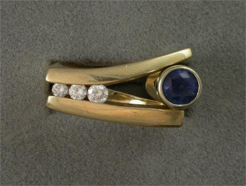 LADY'S 18K YELLOW & WHITE GOLD, GAUTHIER SAPPHIRE & DIAMOND RING CONTAINING A BEZEL SET 5.1 MM BLUE CEYLON SAPPHIRE & 3 CHANNEL-SET ROUND BRILLIANT DIAMONDS WEIGHING AN ESTIMATED .23 CT TOTAL WT. 15.6 GMS ORIGINAL RETAIL PRICE $4100.