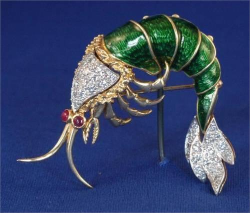 18K GOLD AND ENAMELED SHRIMP PIN, 40mm long <BR><BR><BR>Packing and Shipping: $10
