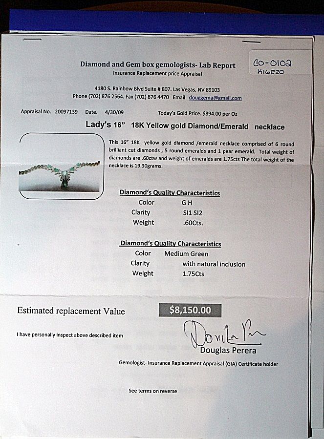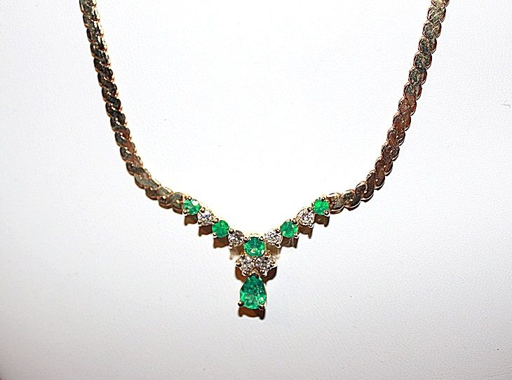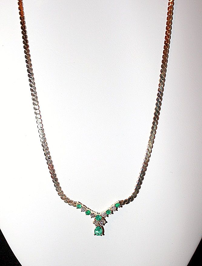 LADY'S 18K YELLOW GOLD 16" NECKLACE WITH 5 ROUND CUT AND 1 PEAR CUT EMERALDS AND 6 ROUND BRILLIANT CUT DIAMONDS. DIAMONDS: 0.60CTW CLARITY: SI1-SI2 COLOR: G-H EMERALDS: 1.75CTW CLARITY: NATURAL INCLUSION COLOR: MED. GREEN. COMES WITH GIA CERTIFIED APPRAISAL. ESTIMATED RETAIL VALUE (AT TIME OF APPRAISAL: 2009): $8,150.00.