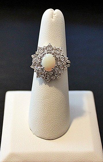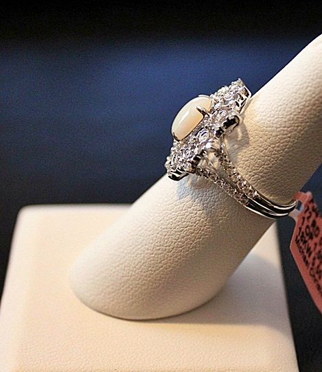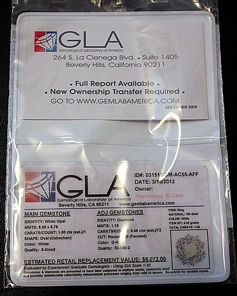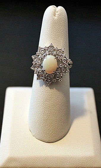 18K WHITE GOLD MICHAEL CHRISTOFF RING WITH 1 OVAL CABOCHON OPAL AND 72 ROUND FULL CUT DIAMONDS. GOLD: 5.50G DIAMONDS: 0.66CTW COLOR: G-H QUALITY: SI-1/SI-2 OPAL: 1.00CTW COLOR: WHITE QUALITY: 5-GOOD. COMES WITH GLA CERTIFICATE. RETAIL PRICE: $6480.00 - $8072.00.