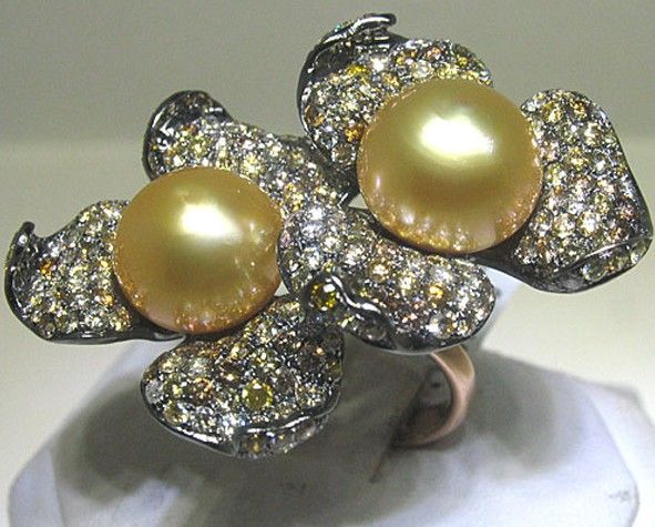 18KW 15.30GRMS LADIES RING WITH 2X13.00MM PEARL & 5.48CT FANCY DIAMONDS
