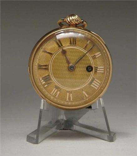 18K GOLD ENGLISH POCKET WATCH WITH FUSEE MOVEMENT. Serial number on movement 7898. Hallmarks to inside of case (1722). Unmarked manufacturer. Open face. Key present. CONDITION: Very good running order. 9-25784