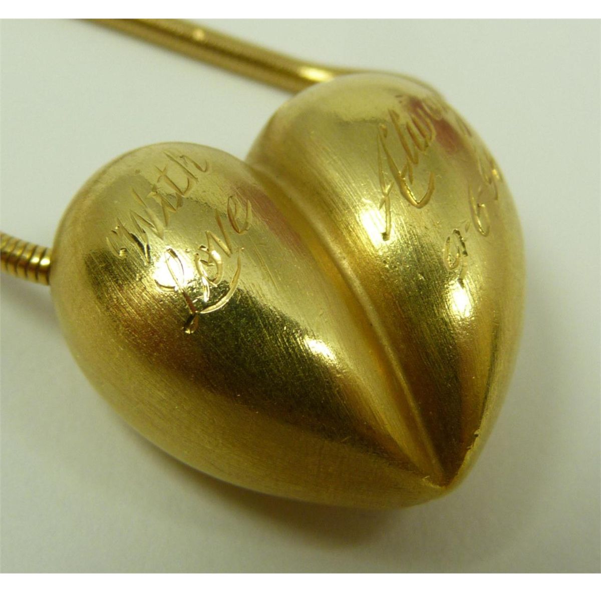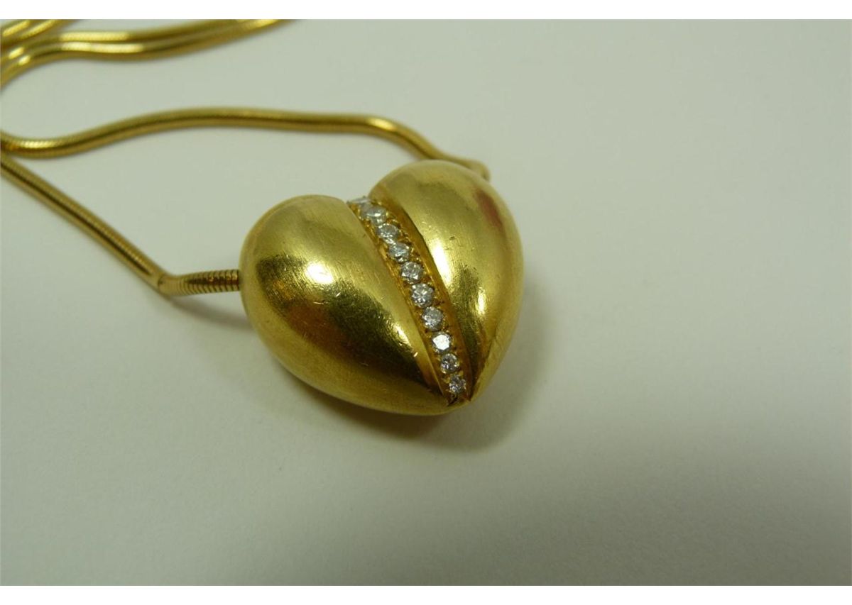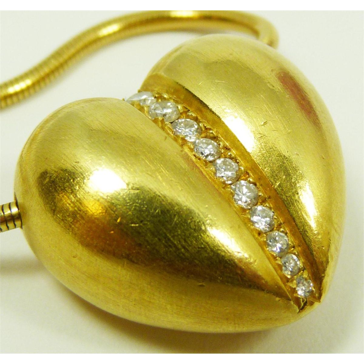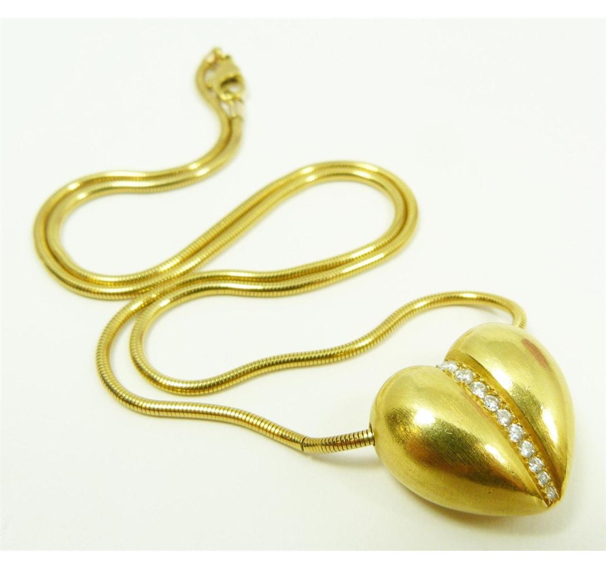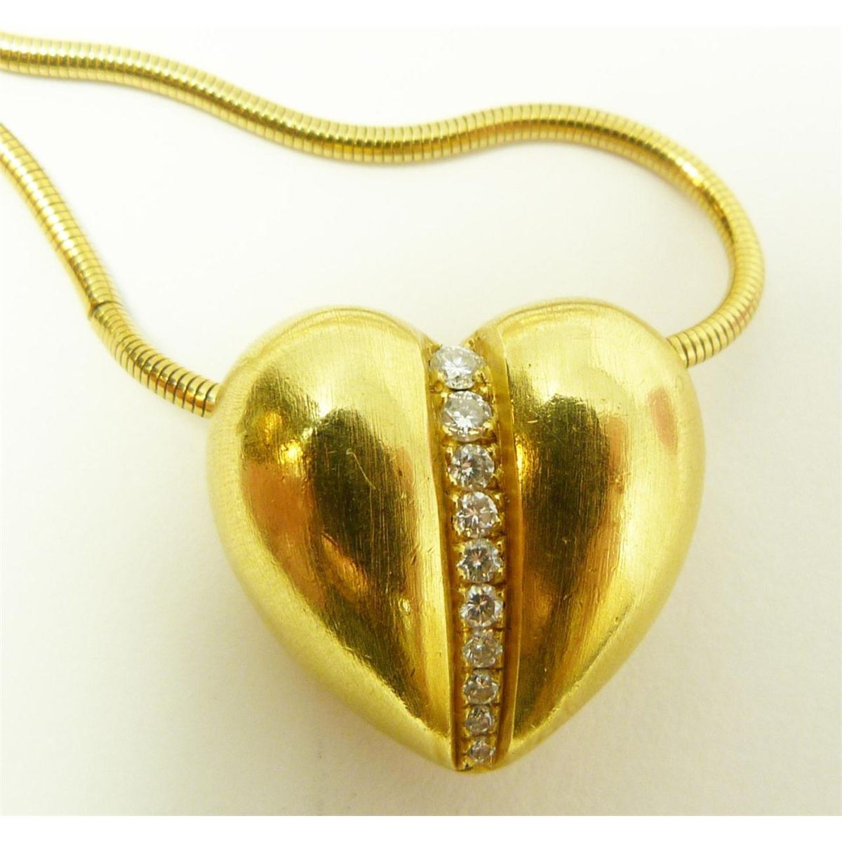 18k yellow gold necklace having figural heart sliding pendant. Heart holds 10 round cut graduating diamond. 18" length (45.7cm). Pendant measures 7/8" height x 1" width (2.2cm x 2.5cm). Total weight of 13.1dwt.