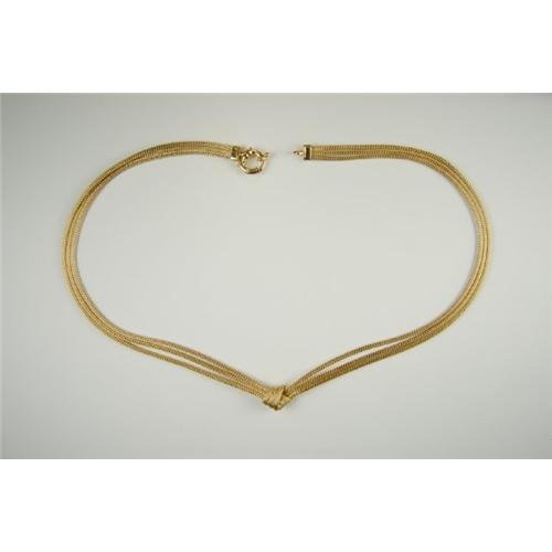 his 18K YELLOW GOLD NECKLACE features a triple Foxtail chain with an elegant 'Knot' at the front. The Necklace is 18 inches in length and it has an exceptionally beautiful and well made 18K Gold Clasp.