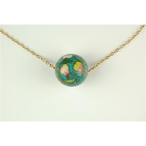 This beautiful 18K Yellow Gold Necklace features a single Cloisonne bead that is 1/2" in diameter. The design of the Cloisonne features leaves and flowers in Rose, Pink, White, on a Turquoise background.