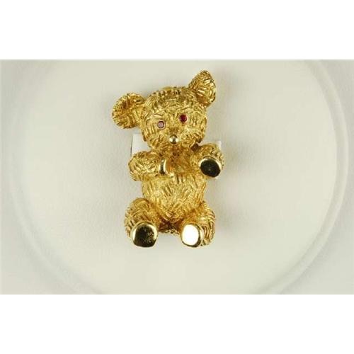 This is a VERY FINE PIN and it is from my Personal Collection. It is an 18K Yellow Gold TEDDY BEAR Pin with cut little RUBY Eyes. The Teddy Bear is SOLID 18K Gold and he measures 1 1/2" sitting on my desk! The adorable Teddy Bear is quite heavy, weighing in at over 20 Grams! This 18K Gold Teddy Bear is extremely well made and a collector's item as well!