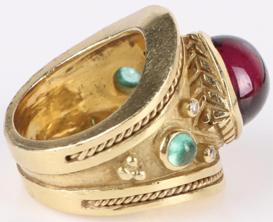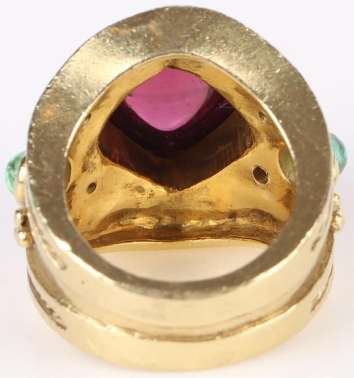 18K gold pink tourmaline diamond emerald ring to include one 5ct cushion cut cabochon tourmaline, two 0.2 carat round cut emeralds, and four 0.01 carat round cut diamonds.