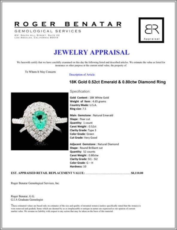 Regarding Appraised Jewelry and Loose Stones - Auctionfarm sends them out to a third party for Retail Replacement Value Appraisals, which are the most common. These types of evaluations are written for insurance needs. This would be the cost to replace the jewelry with an item of equal quality and kind, considered to be the current market price or the replacement value. This type of appraisal is done to protect you in the event of damage or loss of a valuable item. Our appraisals are conducted by independent 3rd Party appraisal firms that utilizes Certified GIA Gemologist. Appraisals should be used for verification of gemstone and/or metal weight, size, and grade only, not actual value. Appraisal value should be considered for insurance purposes only, not actual value, as price varies greatly from retail locations thru out the world. Items should not be purchased with the expectation to resell for appraisal price, or for profit.