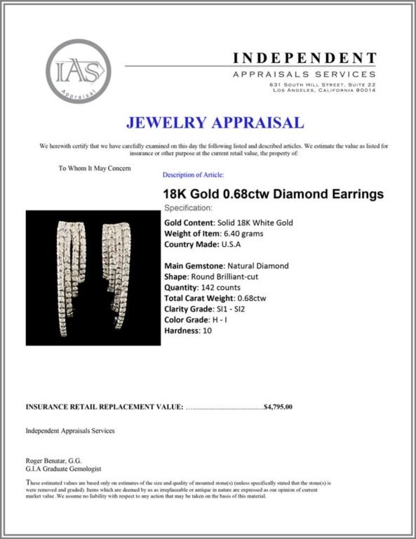 Regarding Appraised Jewelry and Loose Stones - Auctionfarm sends them out to a third party for Retail Replacement Value Appraisals, which are the most common. These types of evaluations are written for insurance needs. This would be the cost to replace the jewelry with an item of equal quality and kind, considered to be the current market price or the replacement value. This type of appraisal is done to protect you in the event of damage or loss of a valuable item. Our appraisals are conducted by independent 3rd Party appraisal firms that utilizes Certified GIA Gemologist. Appraisals should be used for verification of gemstone and/or metal weight, size, and grade only, not actual value. Appraisal value should be considered for insurance purposes only, not actual value, as price varies greatly from retail locations thru out the world. Items should not be purchased with the expectation to resell for appraisal price, or for profit.
