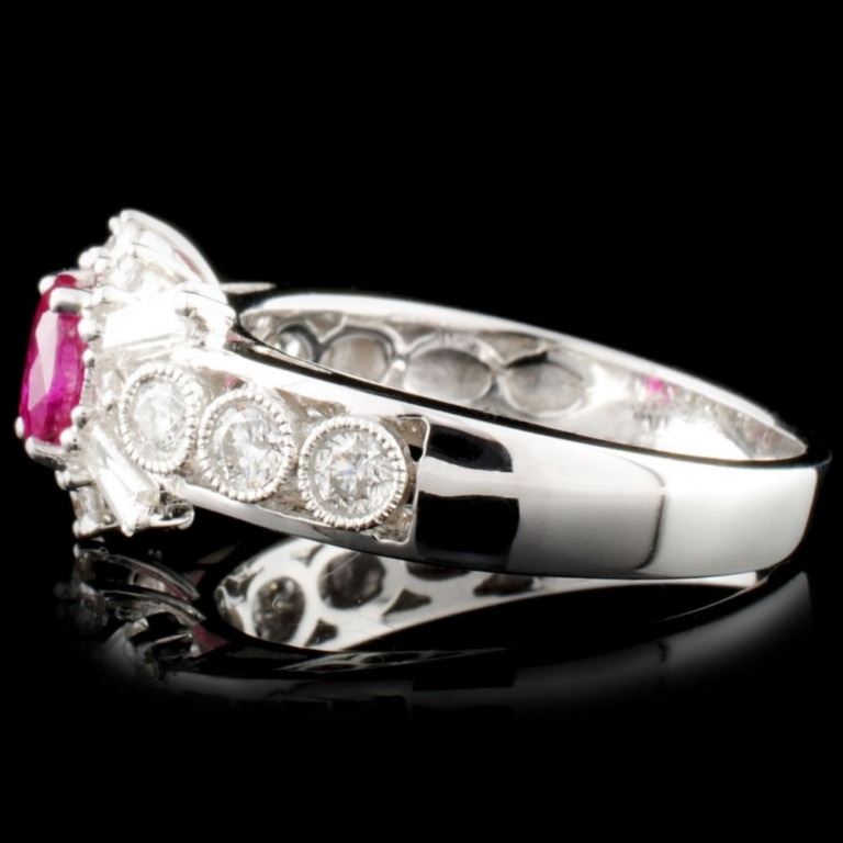 Estimated Retail Replacement Value: $6,320.00Ref: WAG3200Item no.: ARA7004 Specification:Gold Content: Solid 18K White Gold Weight of Item: 4.40 gramsSize: 6.75Country Made: U.S.A Main Gemstone: Natural RubyShape: Oval-shape Quantity: 1 countTotal Carat Weight: 0.73ctwColor: RedClarity: Type 2 Cut Grade: Very GoodAdjacent Gemstone: Natural Diamond Shape: Round Brilliant-cut / BaguetteQuantity: 18 countsTotal Carat Weight: 1.00ctwClarity Grade: SI1 – SI3Color Grade: HHardness: 10 Great Condition - Shipping notes: We ship 4-10 Business day after the clearance of payment. Tracking numbers are emailed once the package(s) are shipped. Most shipments are sent by FEDEX Priority, UPS Priority, or US PRIORITY MAIL INSURED