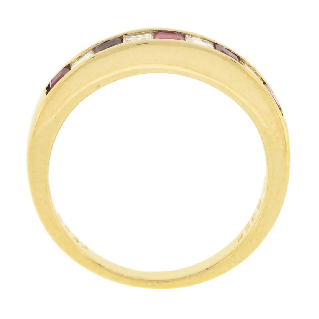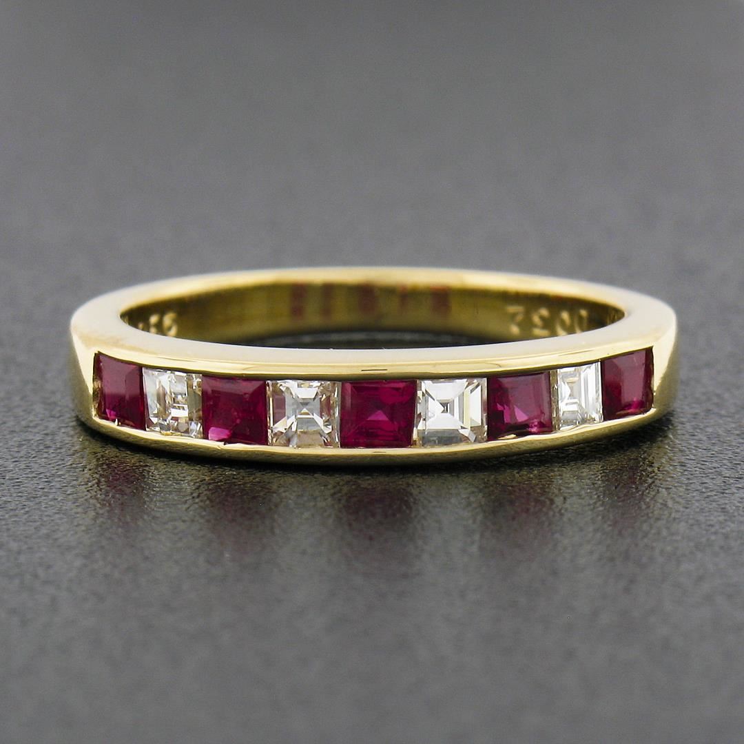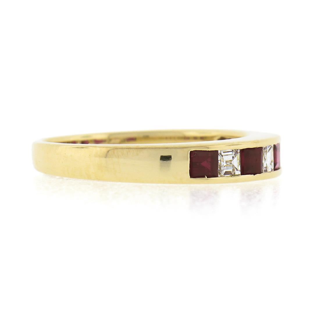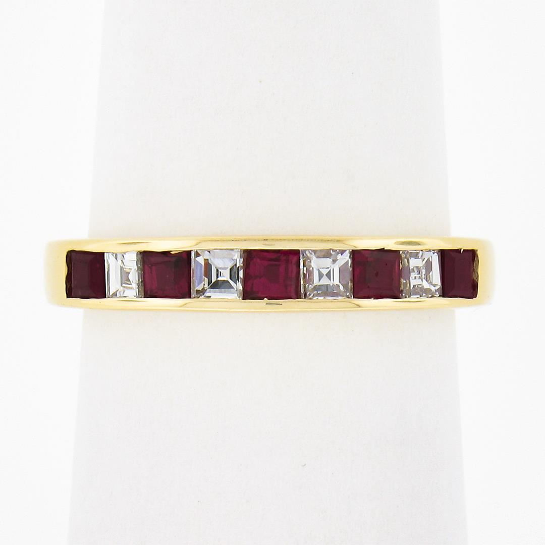 A solid 18k yellow gold ring, with alternating 5 square step cut natural rubies (0.56ctw), and 4 Square Step Cut natural diamonds (F/G - VVS2/VS1 ; 0.32ctw).The ring is size 6.0, weighs a total of 3.51 grams, and measures 3.4mm wide.