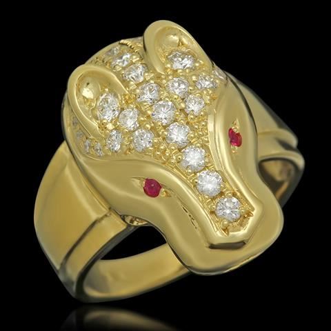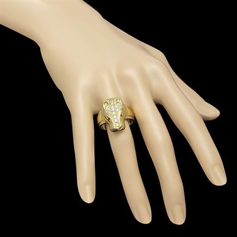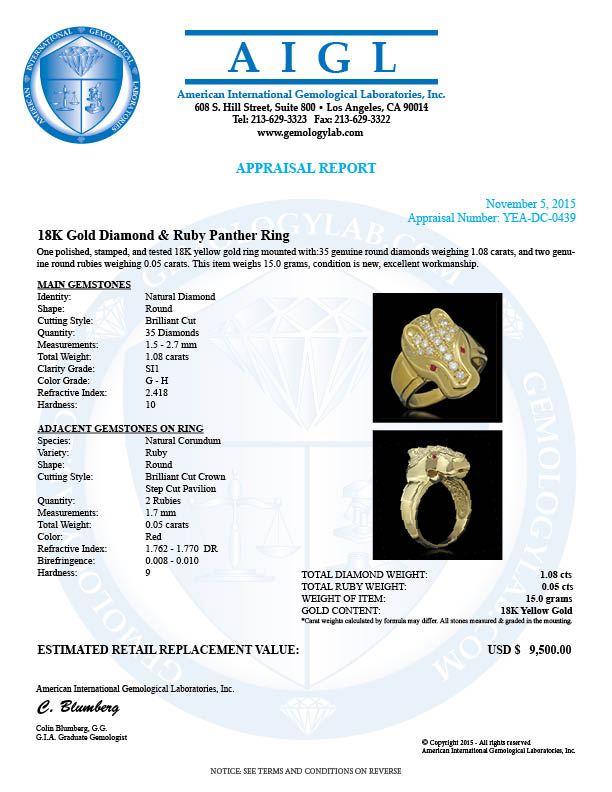 Retail: $9,500.00 ****** 18K Gold 1.08 Diamond Ruby Panther Ring ****** Metal: 14K Solid Gold / Total Item Weight: 15.0 grams / Country Made: United States / / Main Stone: Diamond / Carat Total Weight: 1.08 / Treatment: None / Color Grade: G - H / Clarity: SI1 / Cut: Round Brilliant / / Secondary Stone: Ruby / Color: Red / Carat Total Weight: 0.05 / Treatment: None / Cut: Very Good / / /