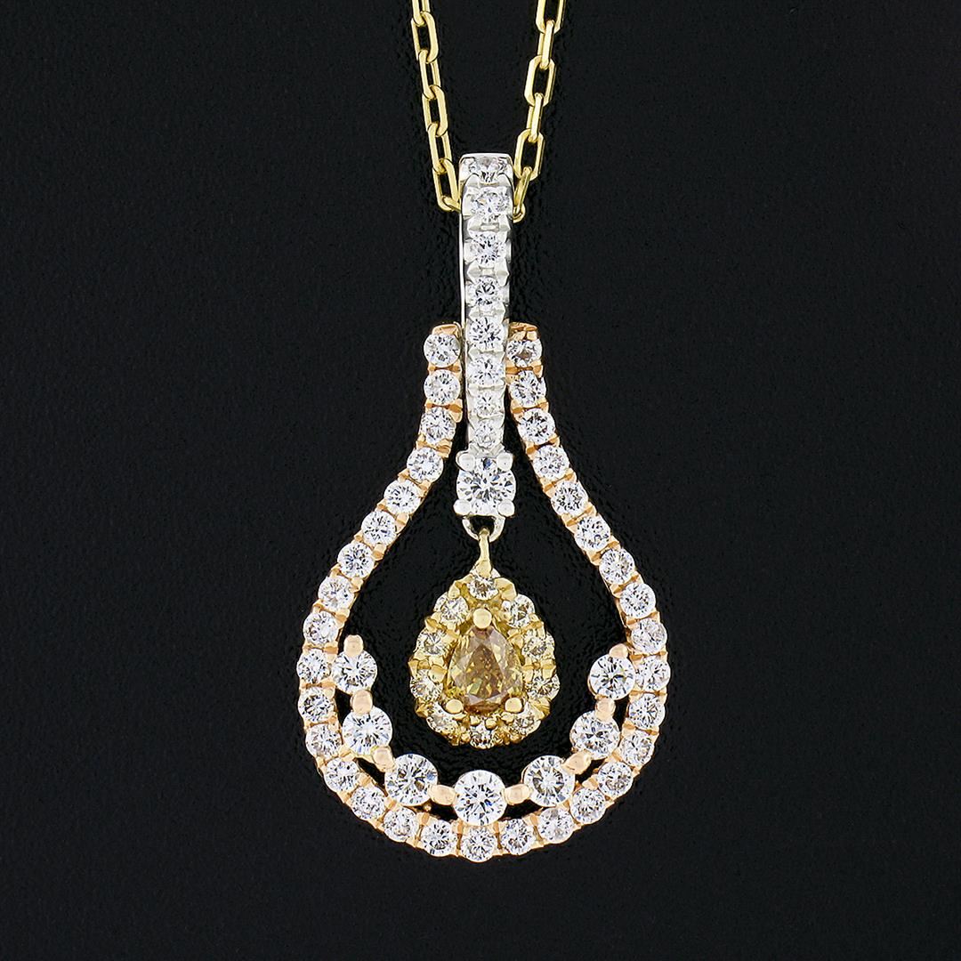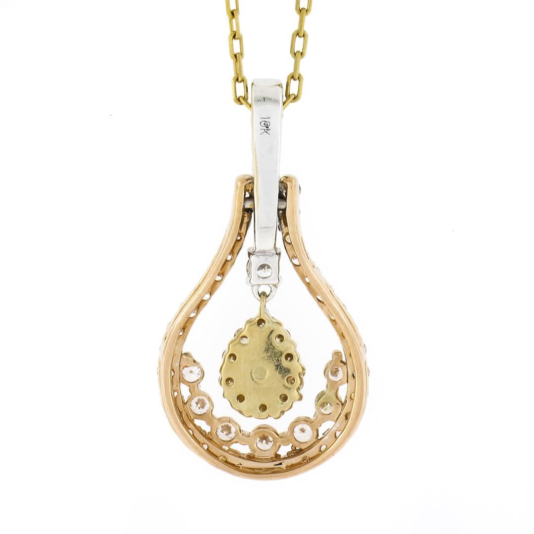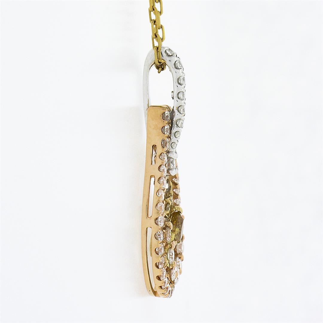 A solid 18k yellow, rose & White gold pendant necklace, with 1 pear cut natural brown diamond (VS2 - 0.20ctw), and 10 round brilliant cut natural yellow diamonds (VS2 - 0.20ctw), and 49 round brilliant cut natural diamonds (G/H - VS1/VS2 ; 0.80ctw). 18 inch cable link chain, 4.51 grams total weight, pendant measures 27.40x14.50mm.