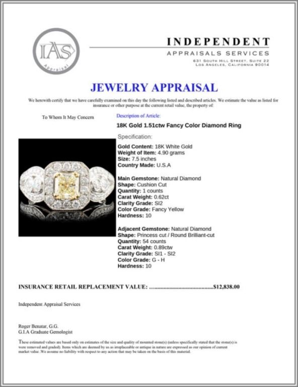 Regarding Appraised Jewelry and Loose Stones - Auctionfarm sends them out to a third party for Retail Replacement Value Appraisals, which are the most common. These types of evaluations are written for insurance needs. This would be the cost to replace the jewelry with an item of equal quality and kind, considered to be the current market price or the replacement value. This type of appraisal is done to protect you in the event of damage or loss of a valuable item. Our appraisals are conducted by independent 3rd Party appraisal firms that utilizes Certified GIA Gemologist. Appraisals should be used for verification of gemstone and/or metal weight, size, and grade only, not actual value. Appraisal value should be considered for insurance purposes only, not actual value, as price varies greatly from retail locations thru out the world. Items should not be purchased with the expectation to resell for appraisal price, or for profit.