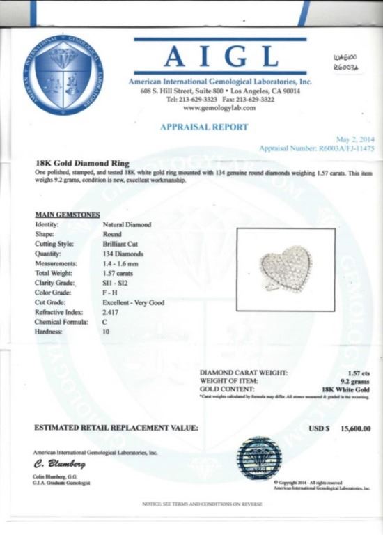 Estimated Retail Replacement Value: $15,600.00Ref: WAG6100Item no.: ARA7038Specification:Gold Content: Solid 18K White GoldWeight of Item: 9.20 gramsSize: 6.5Country Made: U.S.AMain Gemstone: Natural Diamond Shape: Round Brilliant-cutQuantity: 134 countsTotal Carat Weight: 1.57ctClarity Grade: SI1 - SI2Color Grade: F - HHardness: 10 Great Condition - Shipping notes: We ship 4-10 Business day after the clearance of payment. Tracking numbers are emailed once the package(s) are shipped. Most shipments are sent by FEDEX Priority, UPS Priority, or US PRIORITY MAIL INSURED