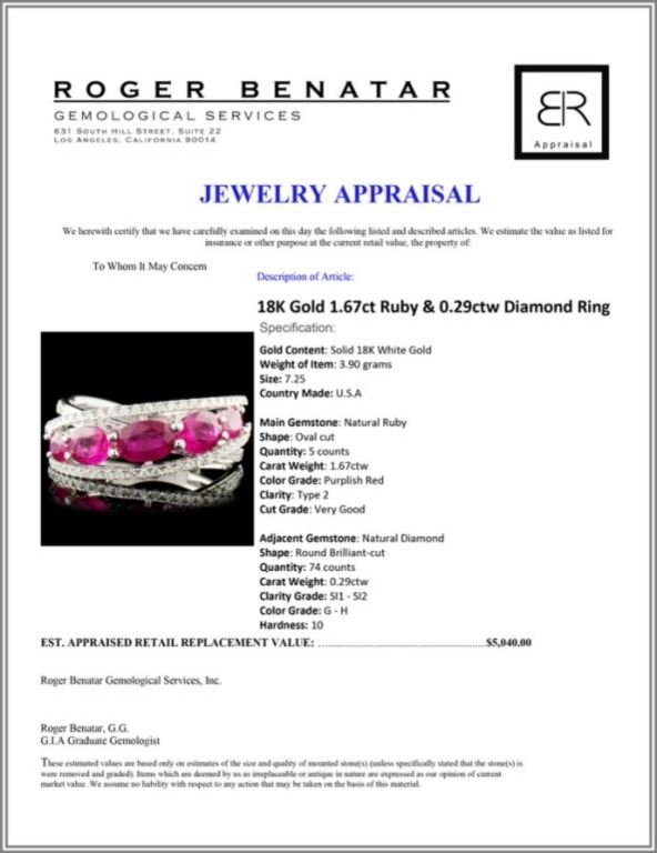 Regarding Appraised Jewelry and Loose Stones - Auctionfarm sends them out to a third party for Retail Replacement Value Appraisals, which are the most common. These types of evaluations are written for insurance needs. This would be the cost to replace the jewelry with an item of equal quality and kind, considered to be the current market price or the replacement value. This type of appraisal is done to protect you in the event of damage or loss of a valuable item. Our appraisals are conducted by independent 3rd Party appraisal firms that utilizes Certified GIA Gemologist. Appraisals should be used for verification of gemstone and/or metal weight, size, and grade only, not actual value. Appraisal value should be considered for insurance purposes only, not actual value, as price varies greatly from retail locations thru out the world. Items should not be purchased with the expectation to resell for appraisal price, or for profit.
