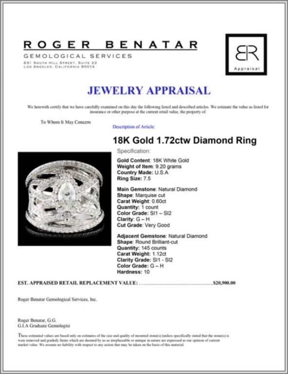 Regarding Appraised Jewelry and Loose Stones - Auctionfarm sends them out to a third party for Retail Replacement Value Appraisals, which are the most common. These types of evaluations are written for insurance needs. This would be the cost to replace the jewelry with an item of equal quality and kind, considered to be the current market price or the replacement value. This type of appraisal is done to protect you in the event of damage or loss of a valuable item. Our appraisals are conducted by independent 3rd Party appraisal firms that utilizes Certified GIA Gemologist. Appraisals should be used for verification of gemstone and/or metal weight, size, and grade only, not actual value. Appraisal value should be considered for insurance purposes only, not actual value, as price varies greatly from retail locations thru out the world. Items should not be purchased with the expectation to resell for appraisal price, or for profit.