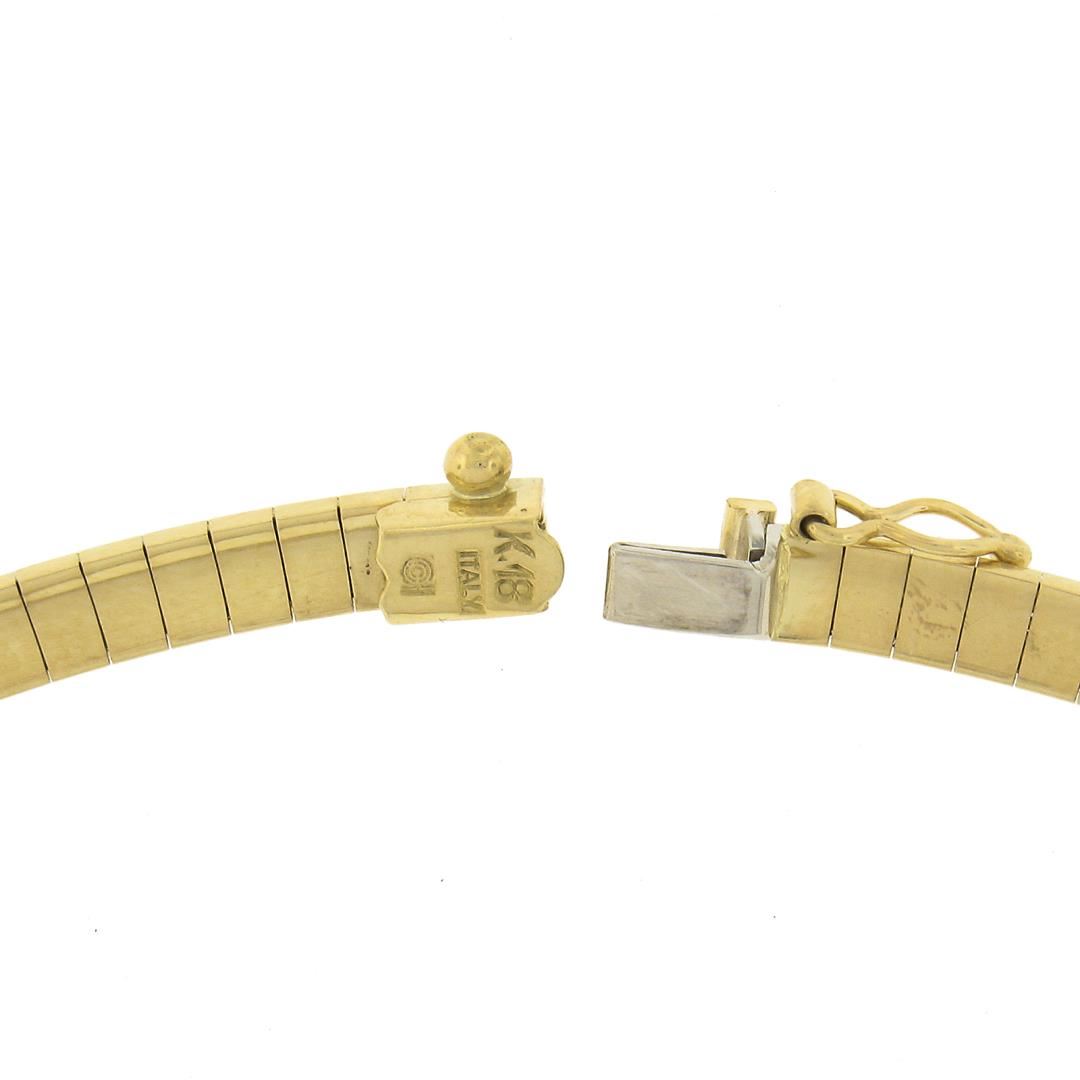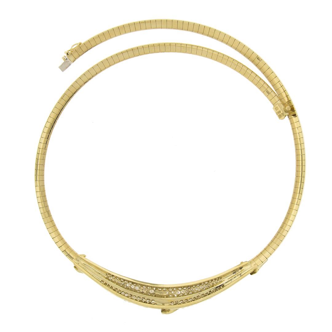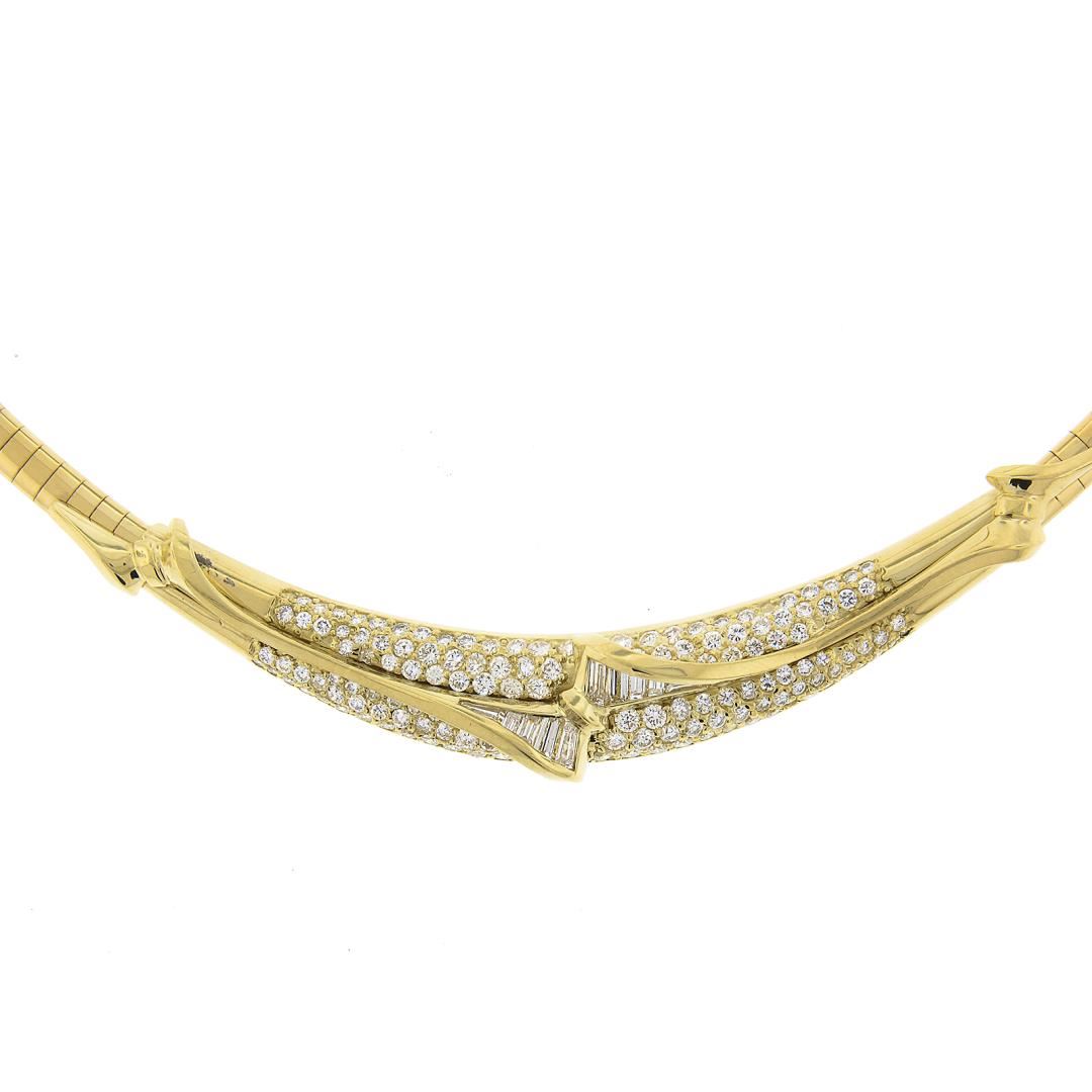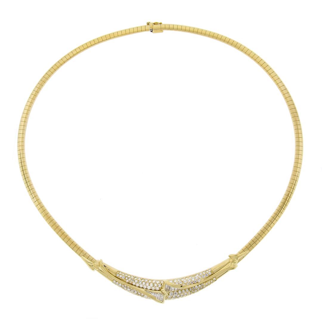 A solid 18k yellow gold omega collier necklace, with numerous of round cut natural diamonds (G/H - VS1/VS2 ; 1.50ctw), and 10 baguette cut natural diamonds (I-K - VS1-SI1 ; 0.35ctw). It weighs a total of 43.60 grams, center piece measures 81.8mm wide, and measures 16 inches in length.