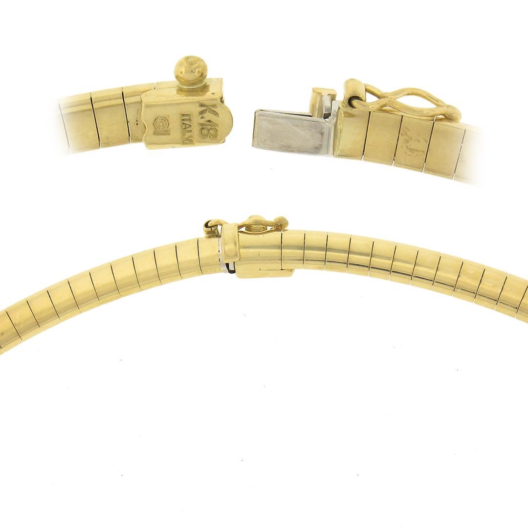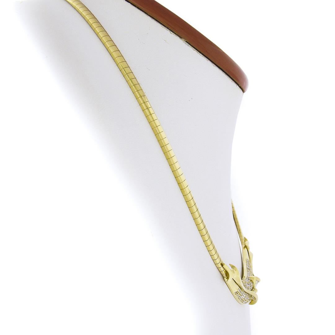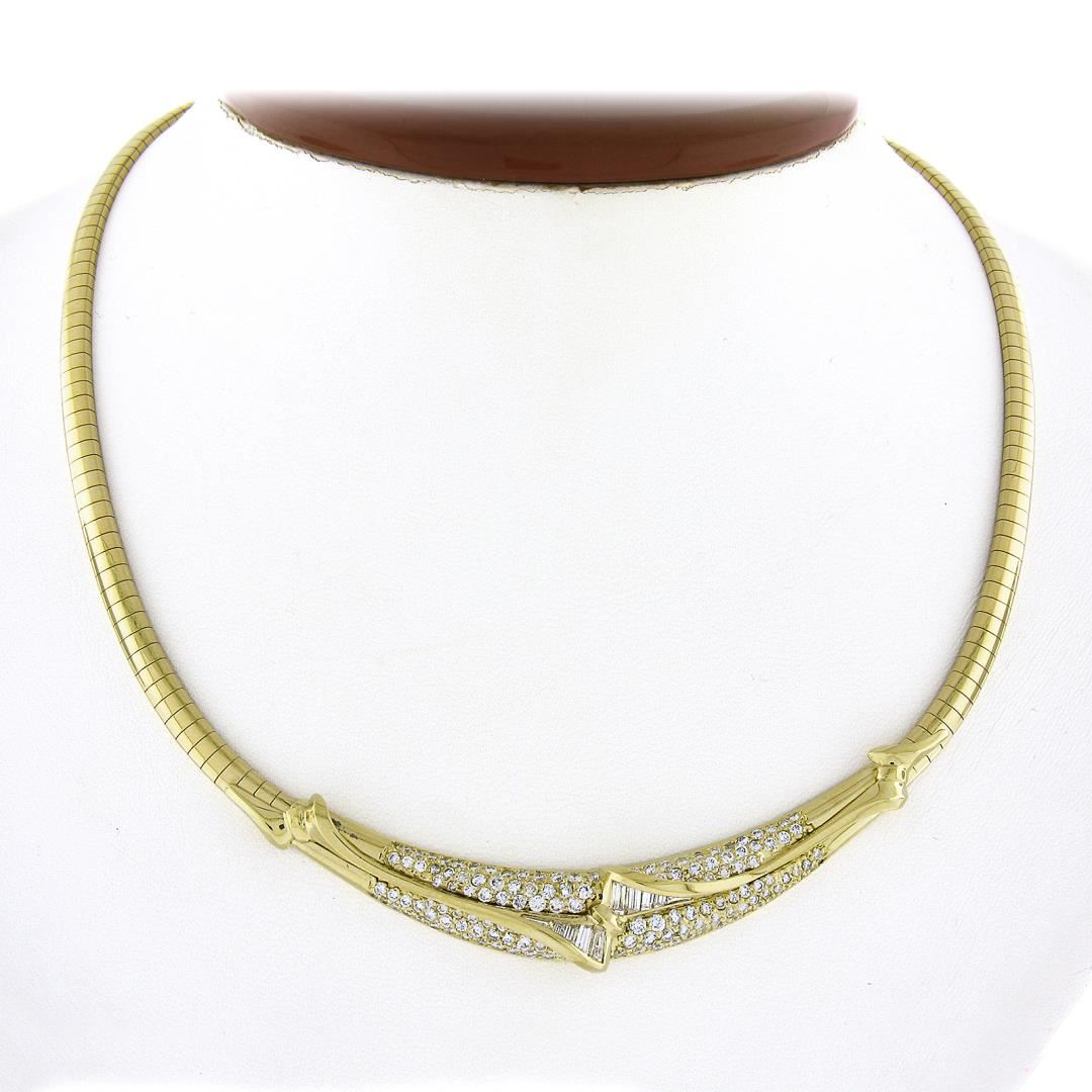 A solid 18k yellow gold omega collier necklace, with numerous of round cut natural diamonds (G/H - VS1/VS2 ; 1.50ctw), and 10 baguette cut natural diamonds (I-K - VS1-SI1 ; 0.35ctw). It weighs a total of 43.60 grams, center piece measures 81.8mm wide, and measures 16 inches in length.