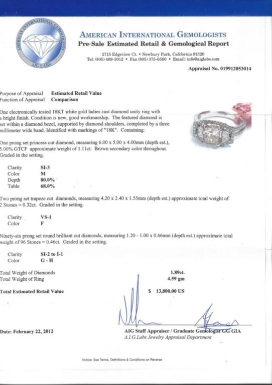 Regarding Appraised Jewelry and Loose Stones - Auctionfarm sends them out to a third party for Retail Replacement Value Appraisals, which are the most common. These types of evaluations are written for insurance needs. This would be the cost to replace the jewelry with an item of equal quality and kind, considered to be the current market price or the replacement value. This type of appraisal is done to protect you in the event of damage or loss of a valuable item. Our appraisals are conducted by independent 3rd Party appraisal firms that utilizes Certified GIA Gemologist. Appraisals should be used for verification of gemstone and/or metal weight, size, and grade only, not actual value. Appraisal value should be considered for insurance purposes only, not actual value, as price varies greatly from retail locations thru out the world. Items should not be purchased with the expectation to resell for appraisal price, or for profit.