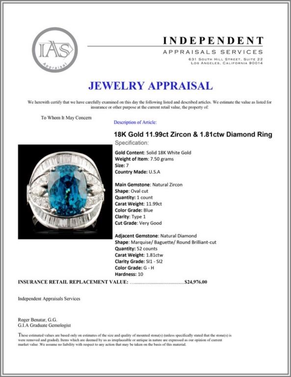 Regarding Appraised Jewelry and Loose Stones - Auctionfarm sends them out to a third party for Retail Replacement Value Appraisals, which are the most common. These types of evaluations are written for insurance needs. This would be the cost to replace the jewelry with an item of equal quality and kind, considered to be the current market price or the replacement value. This type of appraisal is done to protect you in the event of damage or loss of a valuable item. Our appraisals are conducted by independent 3rd Party appraisal firms that utilizes Certified GIA Gemologist. Appraisals should be used for verification of gemstone and/or metal weight, size, and grade only, not actual value. Appraisal value should be considered for insurance purposes only, not actual value, as price varies greatly from retail locations thru out the world. Items should not be purchased with the expectation to resell for appraisal price, or for profit.
