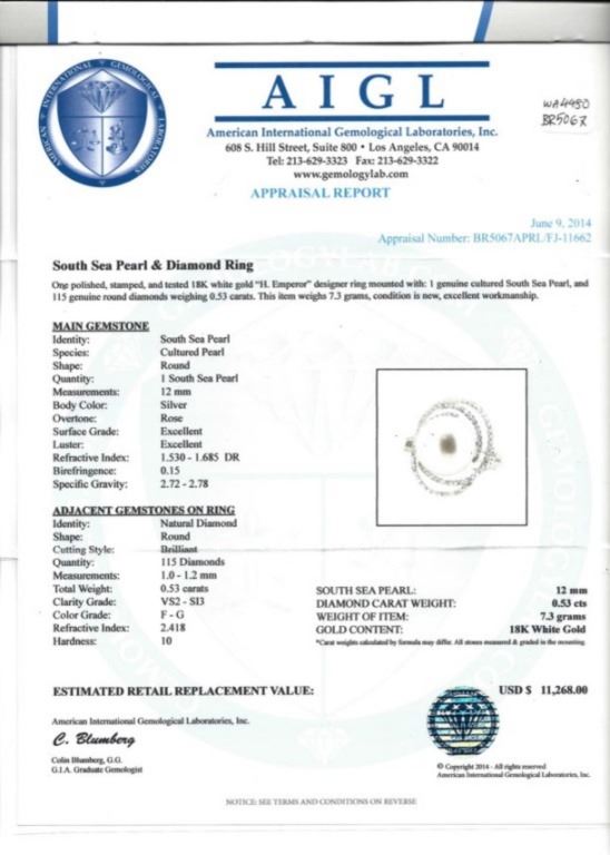 Estimated Retail Replacement Value: $11,268.00Ref: WAG4480Item no.: ARA7026 - BR5067APRLSpecification:Gold Content: Solid 18K White Gold Weight of Item: 7.30 gramsSize: 7Country Made: U.S.A Main Gemstone: South Sea PearlShape: Round-shapeQuantity: 1 countMeasurement: 12 mmColor: SilverSurface Grade: ExcellentLuster: ExcellentAdjacent Gemstone: Natural Diamond Shape: Round Brilliant-cut Total Carat Weight: 0.53ctwClarity Grade: VS2 - SI3Color Grade: F – G Hardness: 10 Great Condition - Shipping notes: We ship 4-10 Business day after the clearance of payment. Tracking numbers are emailed once the package(s) are shipped. Most shipments are sent by FEDEX Priority, UPS Priority, or US PRIORITY MAIL INSURED