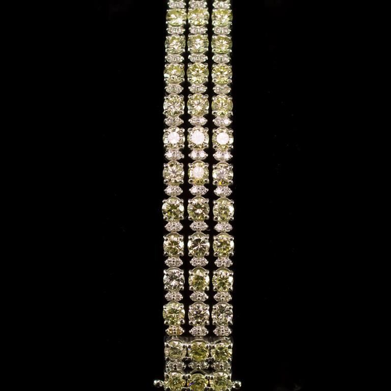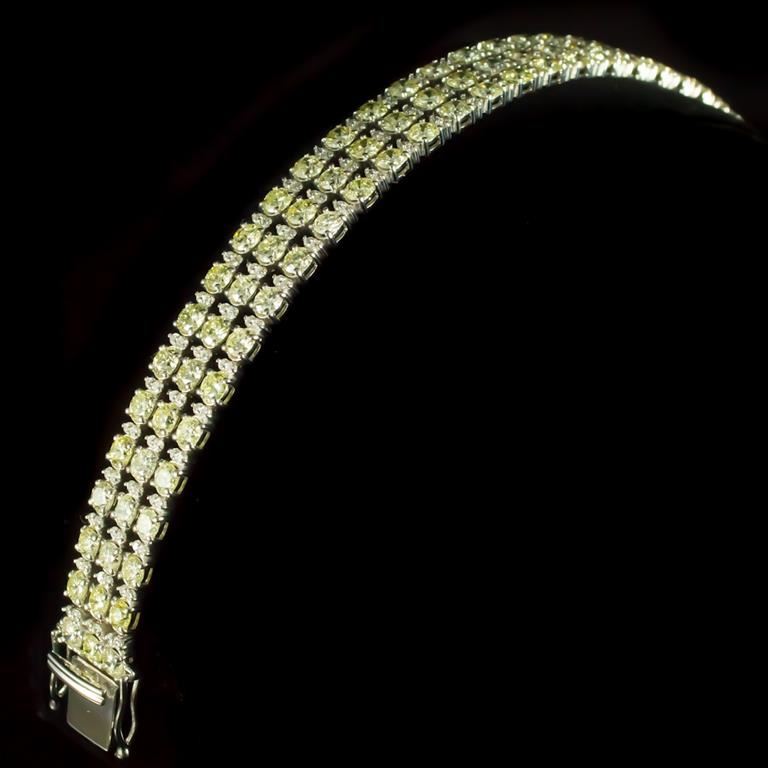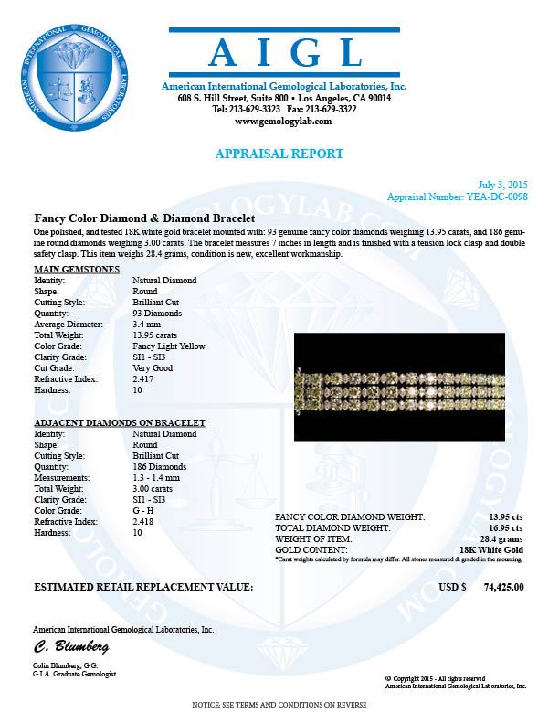 Retail: $74,425.00 ******Fancy Color Diamond & Diamond Bracelet ****** Metal: 18k Solid White Gold / Total Item Weight: 28.4 grams / Country Made: United States / / Main Stone: Diamond / Carat Total Weight: 13.95 / Treatment: None / Color Grade: Famcy Yellow Diamond / Clarity: SI1 - SI3 / Cut: Round Brilliant / / / Secondary Stone: Diamond / Carat Total Weight: 16.95 / Treatment: None / Color Grade: G - H / Clarity: SI1 - SI3 / Cut: Round Brilliant /
