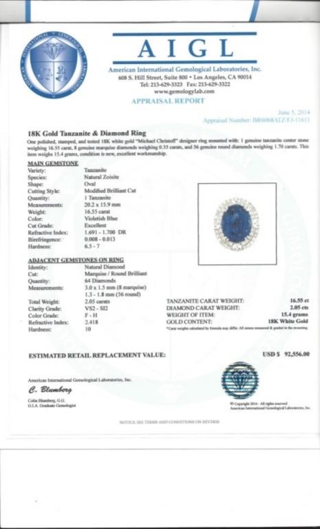 Regarding Appraised Jewelry and Loose Stones - Auctionfarm sends them out to a third party for Retail Replacement Value Appraisals, which are the most common. These types of evaluations are written for insurance needs. This would be the cost to replace the jewelry with an item of equal quality and kind, considered to be the current market price or the replacement value. This type of appraisal is done to protect you in the event of damage or loss of a valuable item. Our appraisals are conducted by independent 3rd Party appraisal firms that utilizes Certified GIA Gemologist. Appraisals should be used for verification of gemstone and/or metal weight, size, and grade only, not actual value. Appraisal value should be considered for insurance purposes only, not actual value, as price varies greatly from retail locations thru out the world. Items should not be purchased with the expectation to resell for appraisal price, or for profit.