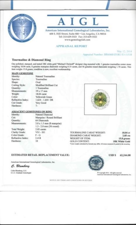 Regarding Appraised Jewelry and Loose Stones - Auctionfarm sends them out to a third party for Retail Replacement Value Appraisals, which are the most common. These types of evaluations are written for insurance needs. This would be the cost to replace the jewelry with an item of equal quality and kind, considered to be the current market price or the replacement value. This type of appraisal is done to protect you in the event of damage or loss of a valuable item. Our appraisals are conducted by independent 3rd Party appraisal firms that utilizes Certified GIA Gemologist. Appraisals should be used for verification of gemstone and/or metal weight, size, and grade only, not actual value. Appraisal value should be considered for insurance purposes only, not actual value, as price varies greatly from retail locations thru out the world. Items should not be purchased with the expectation to resell for appraisal price, or for profit.