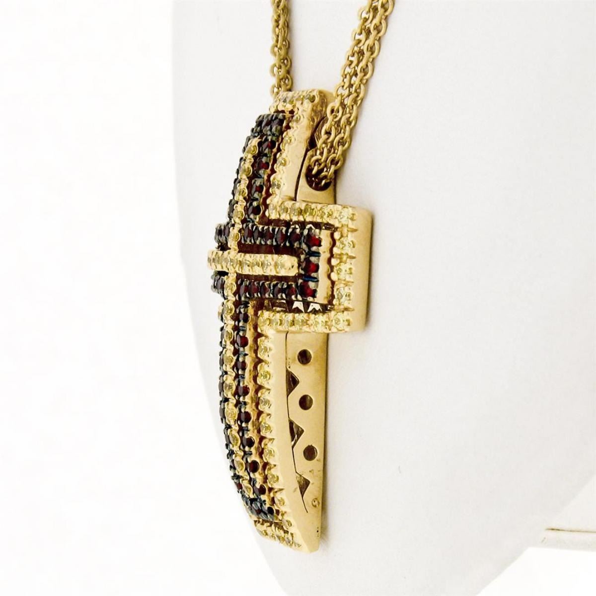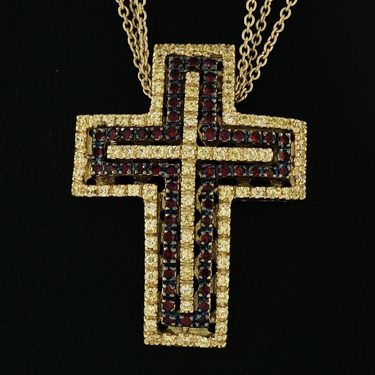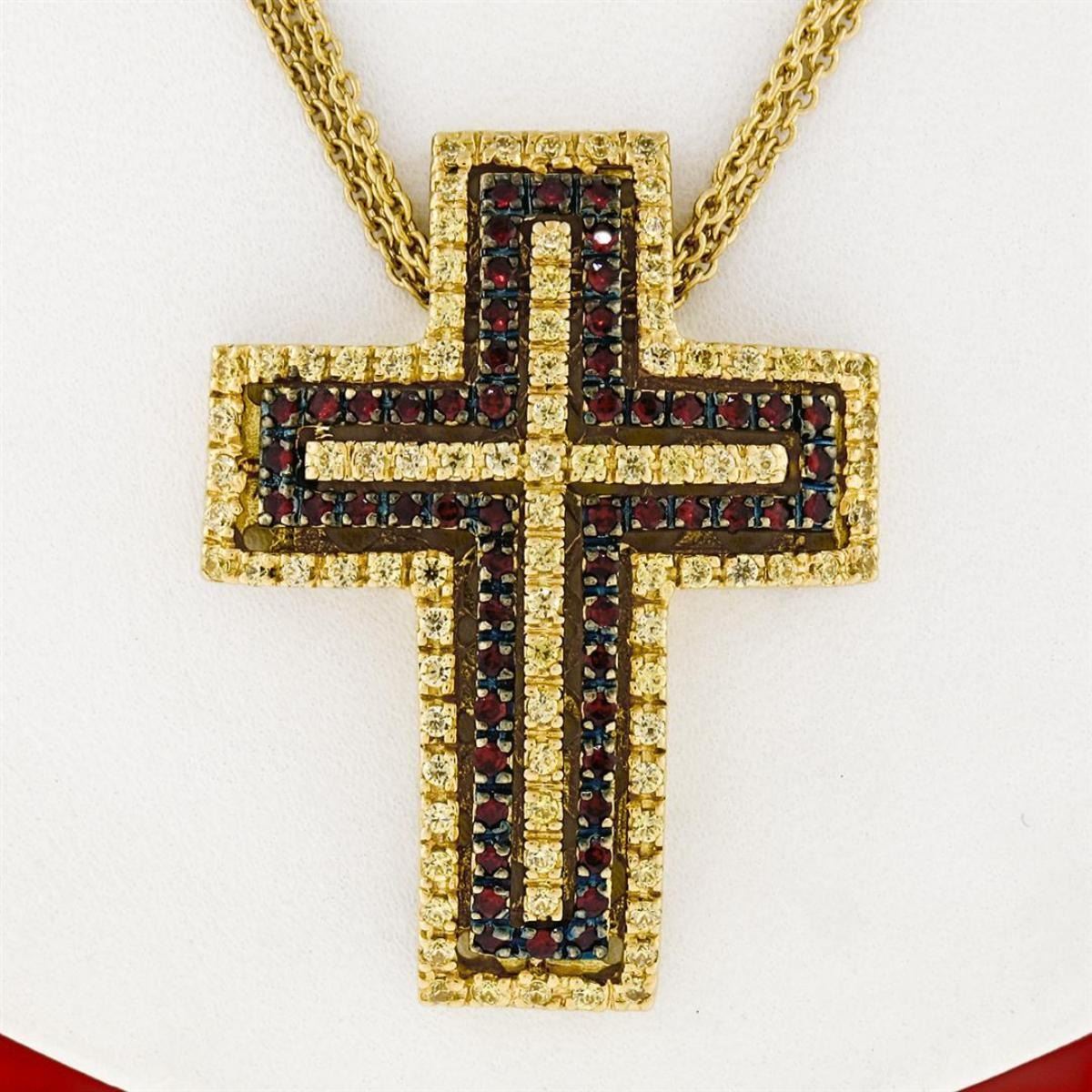 One 18K Gold 2.04ctw Fine Yellow Sapphire & Garnet Large Slide Cross Pendant & Chain. Item Details: Material: 18k Solid Yellow Gold, Weight: 21.38 Grams, Stone(s): (89) Natural Genuine Sapphire - Round Brilliant Cut - Prong Set - Vivid Yellow Color - 1.36ctw (approx.) (TOP QUALITY STONES!), (56) Natural Genuine Garnets - Round Brilliant Cut - Prong Set - Wine Red Color - 0.68ctw (approx.), Chain Type: Fine Multi Strand Cable Link Chain, Chain Length: 16 Inches, Clasp: Lobster Claw Clasp, Width: 27.20mm (1.07"). Height: 35.4mm (1.39"). Thickness: 7.0mm. Condition: Estate piece. Excellent condition and ready to wear.