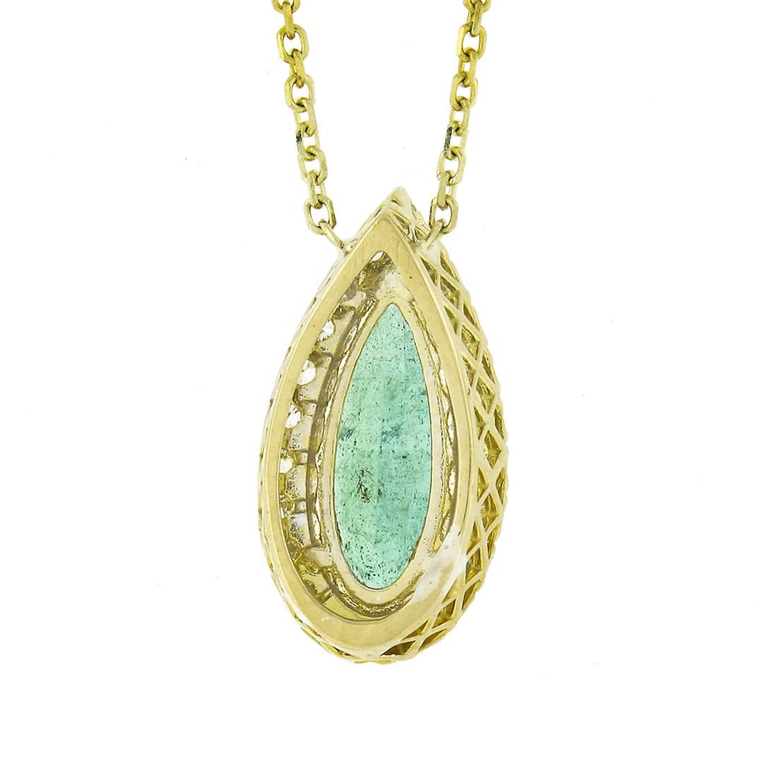 A solid 18k yellow gold terdrop pendant necklace, with 1 pear cut natural emerald (13x5.7mm - 1.85ct), surrounded with a halo of 22 round brilliant cut natural diamonds (G/H - VS2/SI2 ; 0.30ctw). The pendant weighs a total of 3.48 grams, measures 16.75x8.