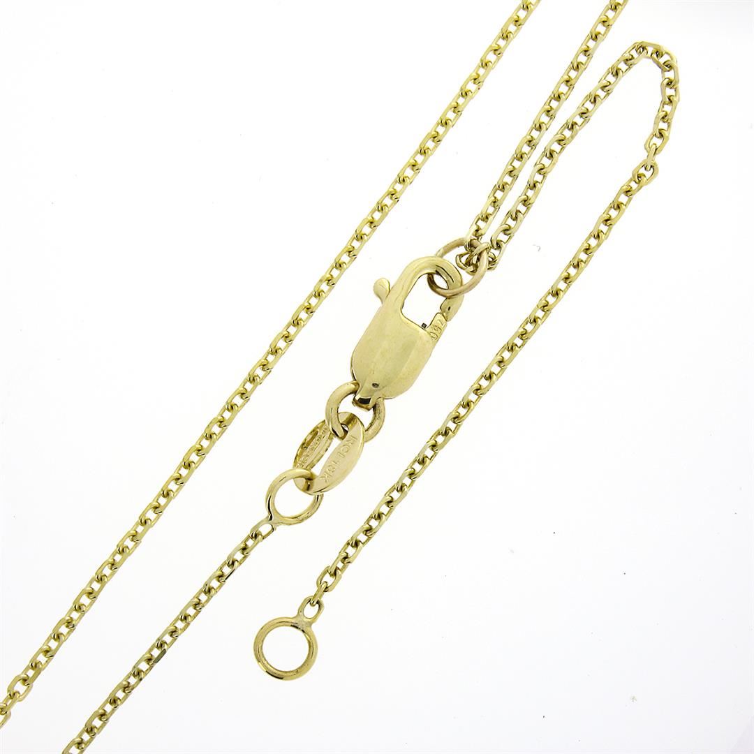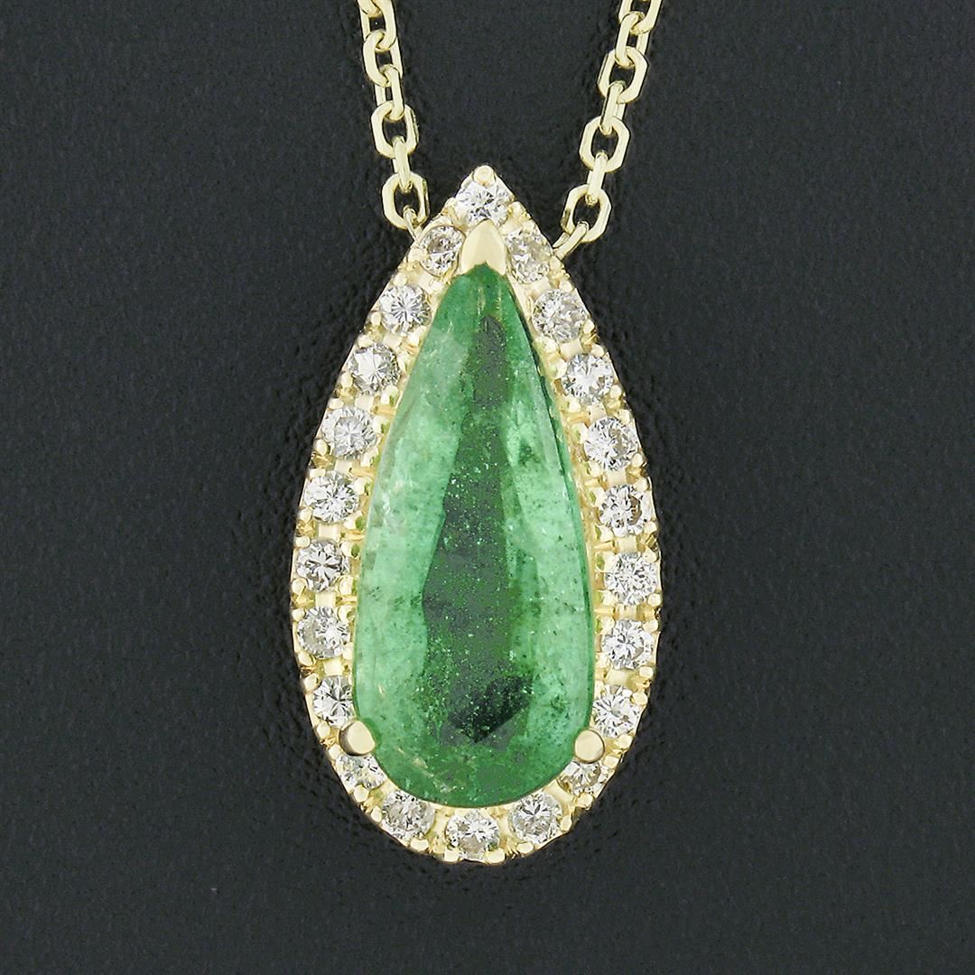 A solid 18k yellow gold terdrop pendant necklace, with 1 pear cut natural emerald (13x5.7mm - 1.85ct), surrounded with a halo of 22 round brilliant cut natural diamonds (G/H - VS2/SI2 ; 0.30ctw). The pendant weighs a total of 3.48 grams, measures 16.75x8.