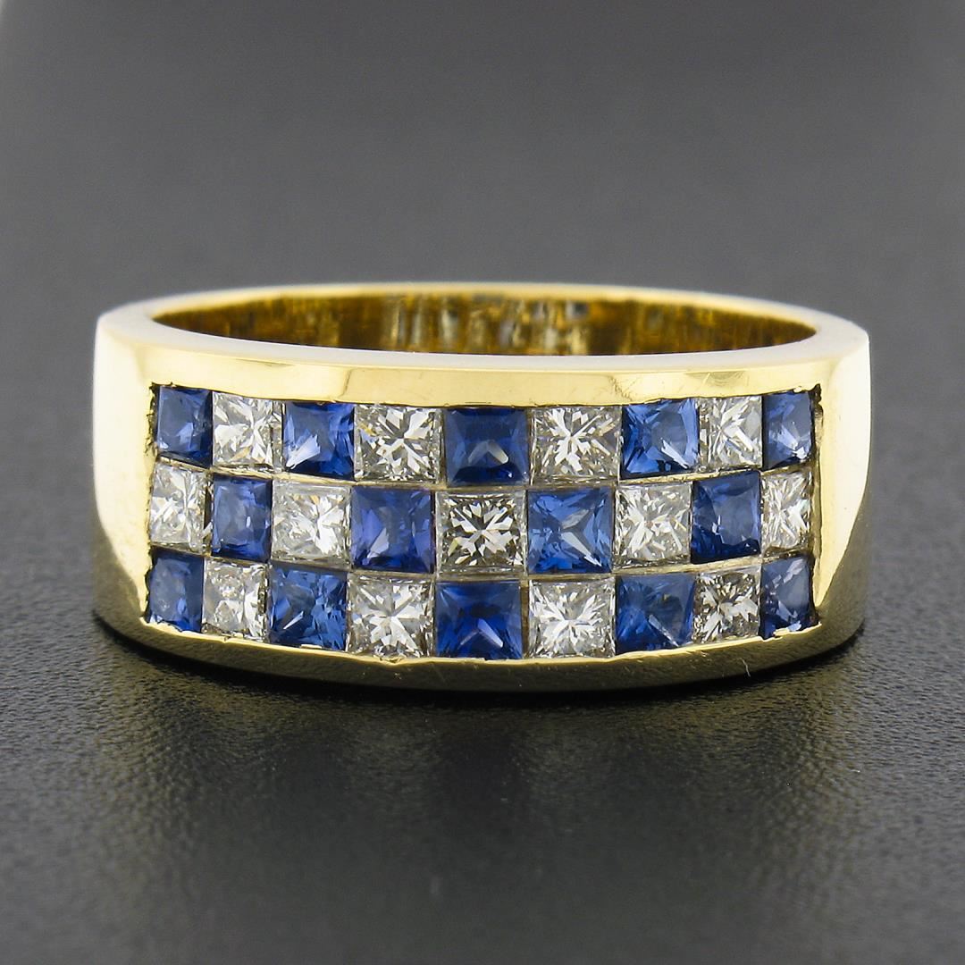 A solid 18k yellow gold wide band ring, with 14 square cut natural sapphires (1.12ctw), and 10 square cut natural diamonds (I/J - VS1/VS2 ; 1.04ctw). The ring is size 7.0, weighs a total of 9.32 grams, and measures 8.3mm wide.