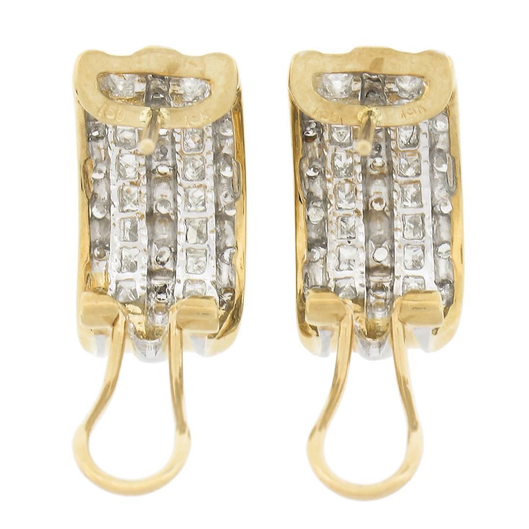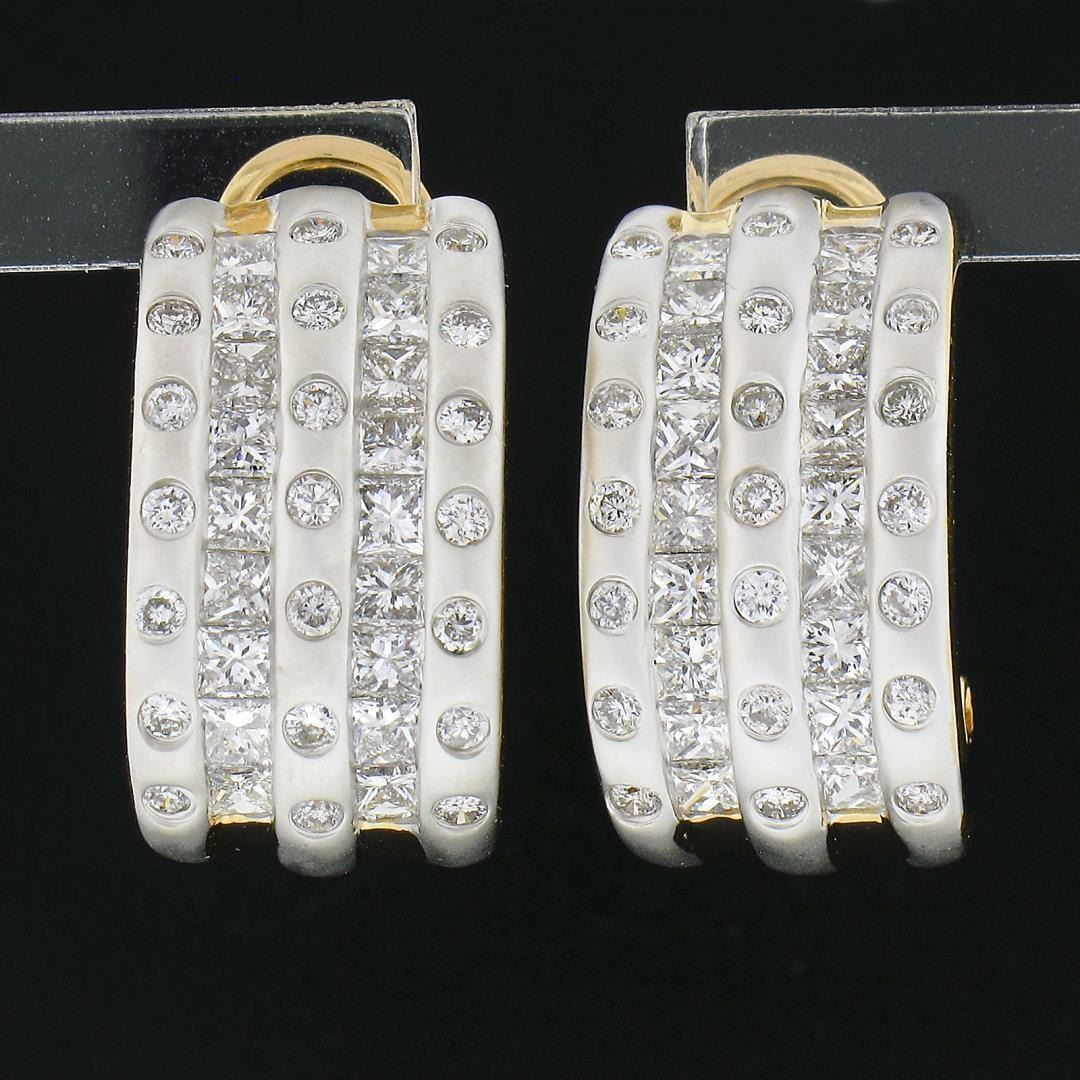 A solid 18k white & yellow gold earrings, with 36 princess cut natural diamonds (G/H - VS1/VS2 & a few SI1 ; 1.70ctw), and 42 round cut natural diamonds (G-I - SI1/SI2 ; 0.60ctw). The earrings measure approximately 19x10.2mm and weigh a total of 9.29 grams.