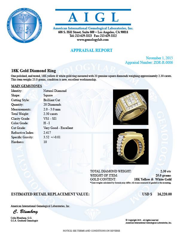 Retail: $16,220.00 ****** 18K Gold 2.30cts Diamond Ring ****** Metal: 18K Yellow & White Solid Gold / Total Item Weight: 25.0 grams / Country Made: United States / / Main Stone: Diamond / Carat Total Weight: 2.30 / Treatment: None / Cut: Very Good - Excellent / Color Grade: H - I / Clarity Grade: VSI - SI1 / Cut: Square Brilliant /