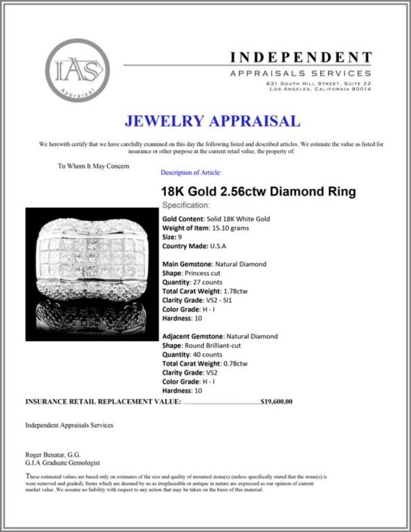 Regarding Appraised Jewelry and Loose Stones - Auctionfarm sends them out to a third party for Retail Replacement Value Appraisals, which are the most common. These types of evaluations are written for insurance needs. This would be the cost to replace the jewelry with an item of equal quality and kind, considered to be the current market price or the replacement value. This type of appraisal is done to protect you in the event of damage or loss of a valuable item. Our appraisals are conducted by independent 3rd Party appraisal firms that utilizes Certified GIA Gemologist. Appraisals should be used for verification of gemstone and/or metal weight, size, and grade only, not actual value. Appraisal value should be considered for insurance purposes only, not actual value, as price varies greatly from retail locations thru out the world. Items should not be purchased with the expectation to resell for appraisal price, or for profit.