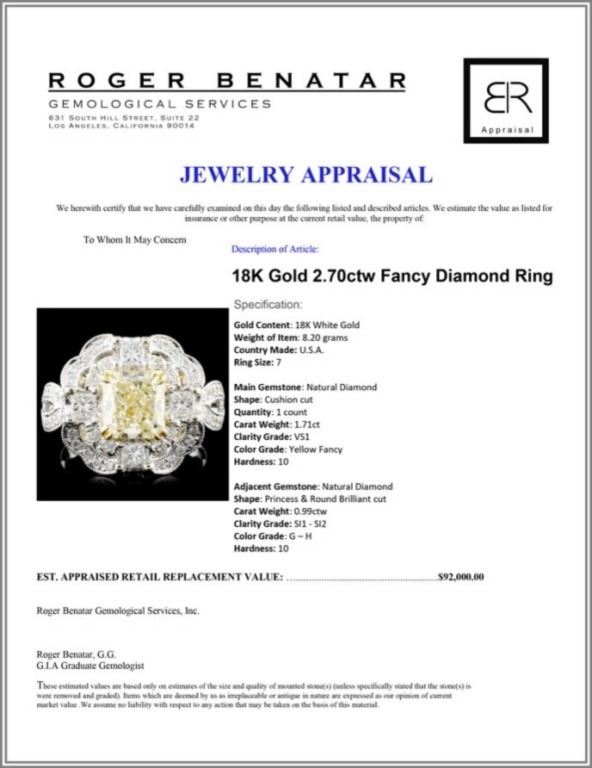 Regarding Appraised Jewelry and Loose Stones - Auctionfarm sends them out to a third party for Retail Replacement Value Appraisals, which are the most common. These types of evaluations are written for insurance needs. This would be the cost to replace the jewelry with an item of equal quality and kind, considered to be the current market price or the replacement value. This type of appraisal is done to protect you in the event of damage or loss of a valuable item. Our appraisals are conducted by independent 3rd Party appraisal firms that utilizes Certified GIA Gemologist. Appraisals should be used for verification of gemstone and/or metal weight, size, and grade only, not actual value. Appraisal value should be considered for insurance purposes only, not actual value, as price varies greatly from retail locations thru out the world. Items should not be purchased with the expectation to resell for appraisal price, or for profit.