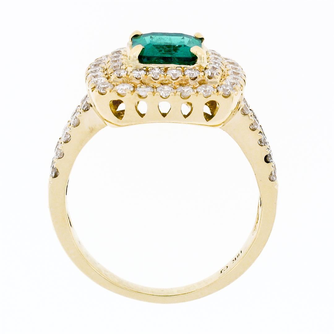 An Estate solid 18k yellow gold engagement ring, featuring 1 Gia certified octagonal step cut natural emerlad, surrounded with a halo of 64 round brilliant cut natural diamonds (F/G - VS2/SI1 ; 1.40ctw). The ring is size 7, weighs a total of 6.40 grams, and measures 14.45mm wide. Comes with all original relevant certifications.