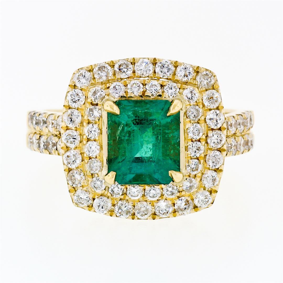 An Estate solid 18k yellow gold engagement ring, featuring 1 Gia certified octagonal step cut natural emerlad, surrounded with a halo of 64 round brilliant cut natural diamonds (F/G - VS2/SI1 ; 1.40ctw). The ring is size 7, weighs a total of 6.40 grams, and measures 14.45mm wide. Comes with all original relevant certifications.