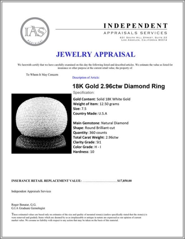 Regarding Appraised Jewelry and Loose Stones - Auctionfarm sends them out to a third party for Retail Replacement Value Appraisals, which are the most common. These types of evaluations are written for insurance needs. This would be the cost to replace the jewelry with an item of equal quality and kind, considered to be the current market price or the replacement value. This type of appraisal is done to protect you in the event of damage or loss of a valuable item. Our appraisals are conducted by independent 3rd Party appraisal firms that utilizes Certified GIA Gemologist. Appraisals should be used for verification of gemstone and/or metal weight, size, and grade only, not actual value. Appraisal value should be considered for insurance purposes only, not actual value, as price varies greatly from retail locations thru out the world. Items should not be purchased with the expectation to resell for appraisal price, or for profit.
