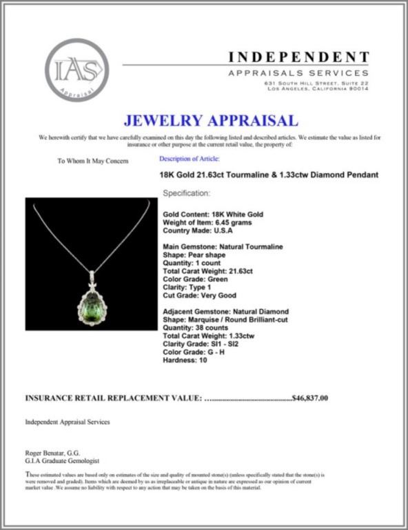 Regarding Appraised Jewelry and Loose Stones - Auctionfarm sends them out to a third party for Retail Replacement Value Appraisals, which are the most common. These types of evaluations are written for insurance needs. This would be the cost to replace the jewelry with an item of equal quality and kind, considered to be the current market price or the replacement value. This type of appraisal is done to protect you in the event of damage or loss of a valuable item. Our appraisals are conducted by independent 3rd Party appraisal firms that utilizes Certified GIA Gemologist. Appraisals should be used for verification of gemstone and/or metal weight, size, and grade only, not actual value. Appraisal value should be considered for insurance purposes only, not actual value, as price varies greatly from retail locations thru out the world. Items should not be purchased with the expectation to resell for appraisal price, or for profit.