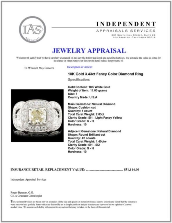 Regarding Appraised Jewelry and Loose Stones - Auctionfarm sends them out to a third party for Retail Replacement Value Appraisals, which are the most common. These types of evaluations are written for insurance needs. This would be the cost to replace the jewelry with an item of equal quality and kind, considered to be the current market price or the replacement value. This type of appraisal is done to protect you in the event of damage or loss of a valuable item. Our appraisals are conducted by independent 3rd Party appraisal firms that utilizes Certified GIA Gemologist. Appraisals should be used for verification of gemstone and/or metal weight, size, and grade only, not actual value. Appraisal value should be considered for insurance purposes only, not actual value, as price varies greatly from retail locations thru out the world. Items should not be purchased with the expectation to resell for appraisal price, or for profit.
