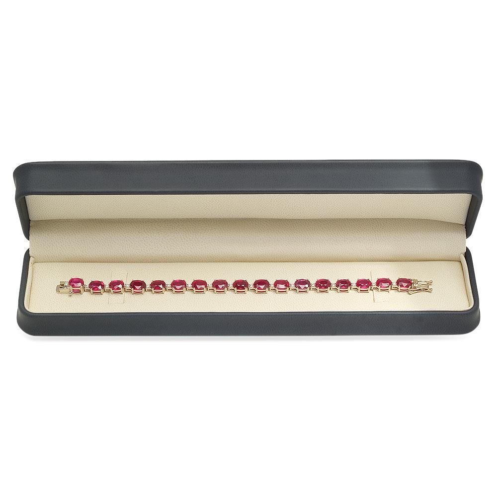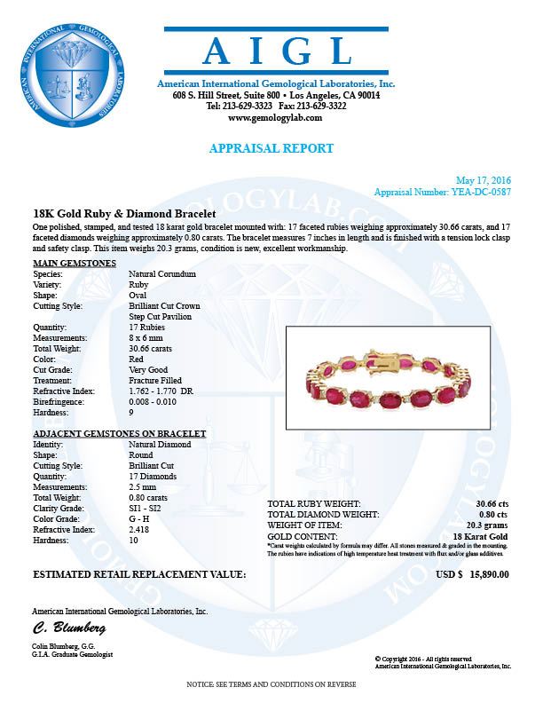 Retail: $15,890.00 ****** 18K Gold 30.66ct Ruby .8ct Diamond Bracelet****** Metal: 18K Solid Gold / Total Item Weight: 20.3 grams / Country Made: United States / / Main Stone: Ruby / Color: Red / Carat Total Weight: 30.66 / Treatment: Fracture Filled / Cut: Very Good / / Secondary Stone: Diamond / Carat Total Weight: .8 / Treatment: None / Color Grade: G - H / Clarity: SI1 - SI2 / Cut: Round Brilliant /