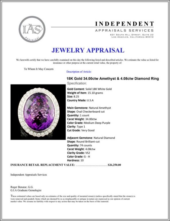 Regarding Appraised Jewelry and Loose Stones - Auctionfarm sends them out to a third party for Retail Replacement Value Appraisals, which are the most common. These types of evaluations are written for insurance needs. This would be the cost to replace the jewelry with an item of equal quality and kind, considered to be the current market price or the replacement value. This type of appraisal is done to protect you in the event of damage or loss of a valuable item. Our appraisals are conducted by independent 3rd Party appraisal firms that utilizes Certified GIA Gemologist. Appraisals should be used for verification of gemstone and/or metal weight, size, and grade only, not actual value. Appraisal value should be considered for insurance purposes only, not actual value, as price varies greatly from retail locations thru out the world. Items should not be purchased with the expectation to resell for appraisal price, or for profit.