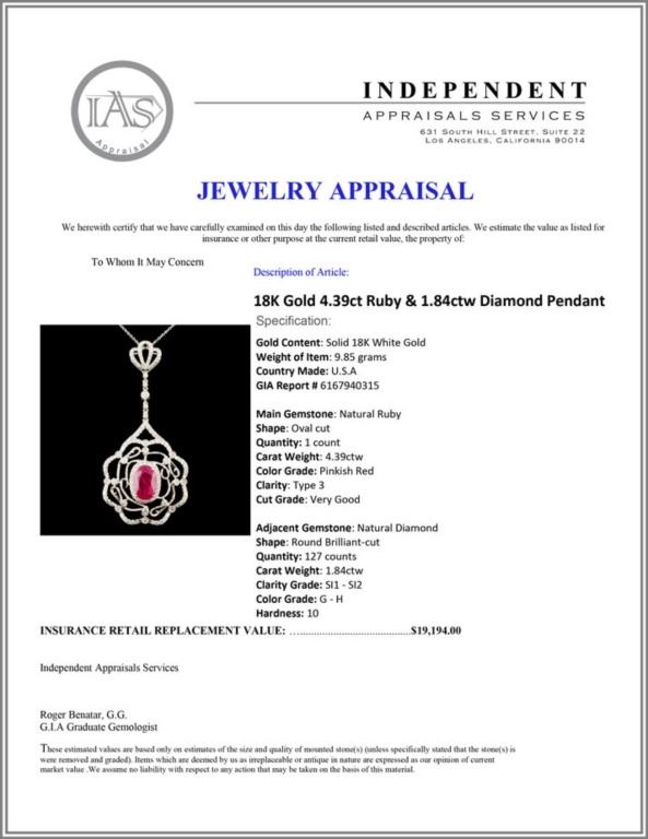 Regarding Appraised Jewelry and Loose Stones - Auctionfarm sends them out to a third party for Retail Replacement Value Appraisals, which are the most common. These types of evaluations are written for insurance needs. This would be the cost to replace the jewelry with an item of equal quality and kind, considered to be the current market price or the replacement value. This type of appraisal is done to protect you in the event of damage or loss of a valuable item. Our appraisals are conducted by independent 3rd Party appraisal firms that utilizes Certified GIA Gemologist. Appraisals should be used for verification of gemstone and/or metal weight, size, and grade only, not actual value. Appraisal value should be considered for insurance purposes only, not actual value, as price varies greatly from retail locations thru out the world. Items should not be purchased with the expectation to resell for appraisal price, or for profit.