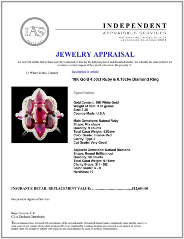 Regarding Appraised Jewelry and Loose Stones - Auctionfarm sends them out to a third party for Retail Replacement Value Appraisals, which are the most common. These types of evaluations are written for insurance needs. This would be the cost to replace the jewelry with an item of equal quality and kind, considered to be the current market price or the replacement value. This type of appraisal is done to protect you in the event of damage or loss of a valuable item. Our appraisals are conducted by independent 3rd Party appraisal firms that utilizes Certified GIA Gemologist. Appraisals should be used for verification of gemstone and/or metal weight, size, and grade only, not actual value. Appraisal value should be considered for insurance purposes only, not actual value, as price varies greatly from retail locations thru out the world. Items should not be purchased with the expectation to resell for appraisal price, or for profit.